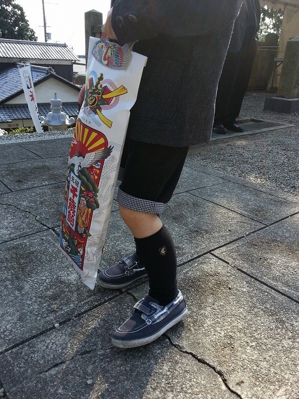 お参りも「カシコミィ、カシコミィ・・・」と無事終わり、子供の手には千歳飴が…自分の時の記憶が全然なかったので、袋の中には何が入ってるのか不思議に思いながら帰宅。開けてみると、お菓子や昔懐かしい紙風船が入ってたり、もちろん千歳飴も!飴にはまだ興味がない息子はおもちゃで遊びながらわぁ!わぁ!走り回ってました…