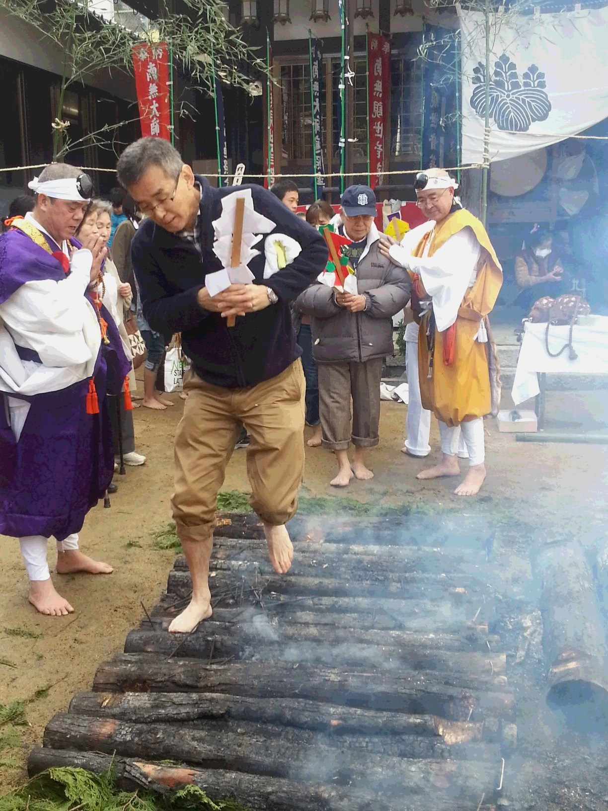 皆さん、真剣に火渡りしておりますが自分は火が怖いので靴を履いて渡りました。